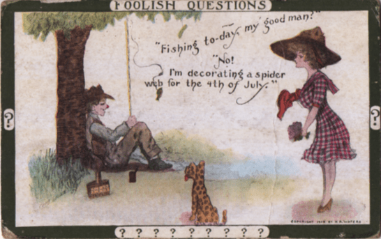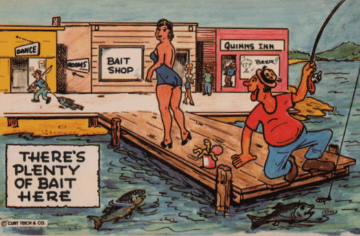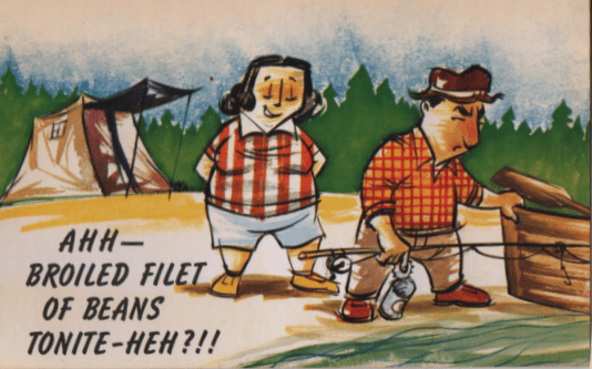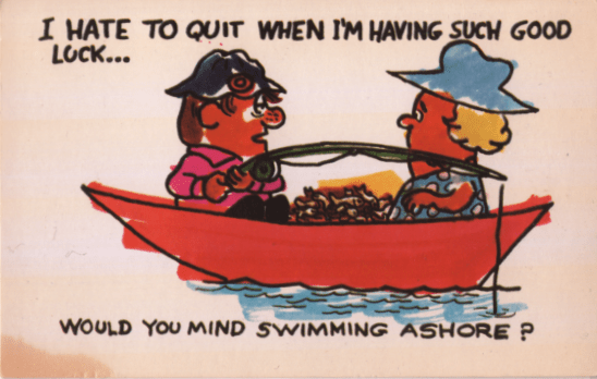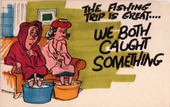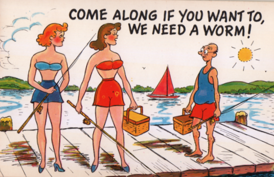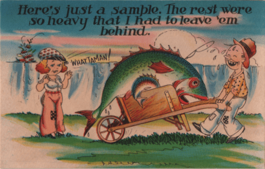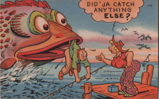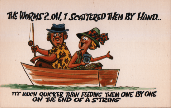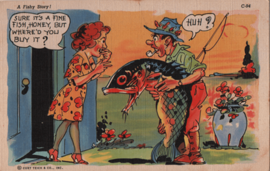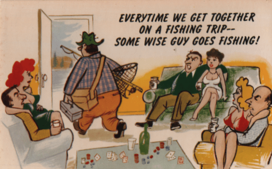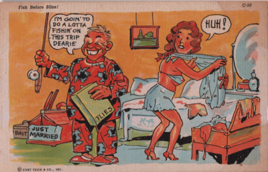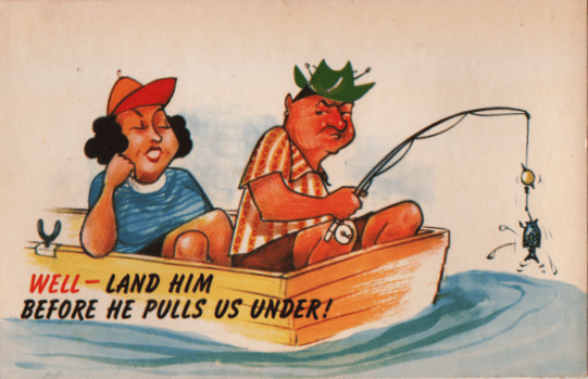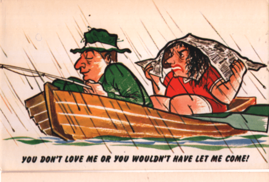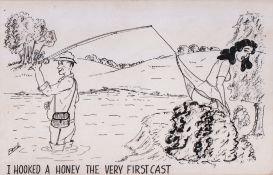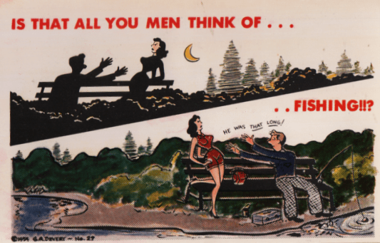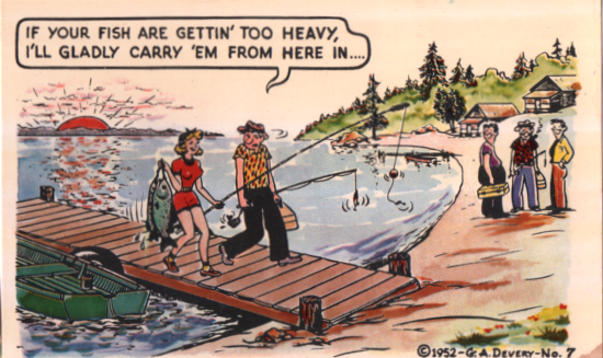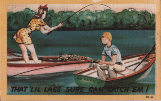 Rare, rare indeed, our alien friend will learn from our postcards, is the married couple who enjoy the fishing trip on a basis of complete understanding and shared passion. Mind you, if that alien also gets hod of the postcards about how husbands behave around the house, there might be an antidote to this version of twentieth century womanhood, but since fishing postcards predominate, this may be too much to hope. (By the way, James Branch Cabell’s wife was known to state, with pride, that she had never read even one of her husband’s books. These things do have a way of evening out.)