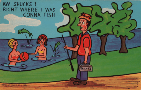 This was never the fault of the fisherman, of course, but of huge masses of women who chose to swim in the traditional sacred fishing sites (to judge by how many more times than two this particular gag was used.)