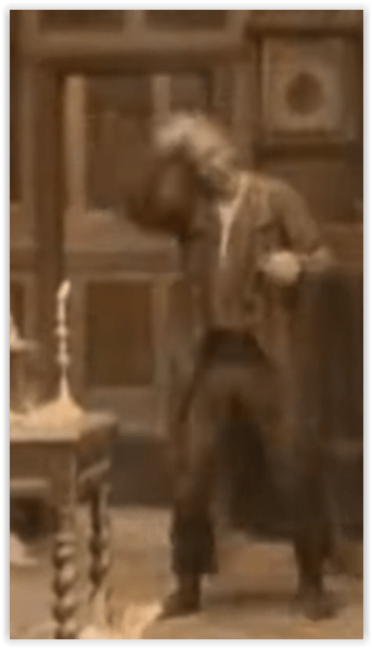 Stewart is grave; his clock shows 9:18. Bob is in great apprehension; hurrying in, he begins to write furiously. Scrooge waits a moment and then calls “Mr. Cratchit: a word with you.” The cold, sadistic schoolmaster is back; Bob comes out of the Tank, clutching his own elbows for warmth and moral support. “What do you mean by coming here at this time of day?” “I’m very sorry, sir. I am behind my time.” “Oh, yes, you are. Indeed you are.” “It’s only once a year, sir. I was making rather merry yesterday, sir.” Bob nods along as Scrooge begins his scold. Come the line about raising the clerk’s salary, a gleeful Scrooge thumps his desk with a triumphant “Ha!” and adds “Merry Christmas, Bob!” Bob lunges for the fire irons to defend himself against the madman. Scrooge, observing this, delivers the next lines in self-defense. Bob takes a while to understand it all, but once the threat of violence subsides, Scrooge orders him to make up the fire, hands rubbing together as if the old man has noticed the cold for the first tie. Bob sets to it with a right good will.