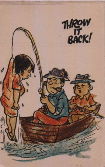 Ideally, to that alien observer we discussed last time, who thinks, from looking over our postcards, that the fisherman was king of our universe, a wife would exist to encourage and support her fish-hunting hubby. And yet they would see, again and again, that our cartoonists insisted it was not so.