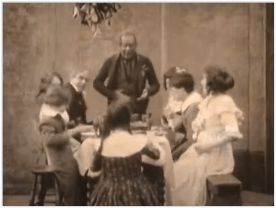 In Hicks, we see Fred’s party already begun, with Fred delivering the business about how Uncle Scrooge won’t come and dine with us, and don’t miss much of a dinner. Scrooge is moving slowly toward the door, passes it, comes back, goes up and raises a hand to the knocker and stops. He thinks this over, and reaches up again, knocking just twice before starting away from the door. He is well onto the sidewalk when the door opens and, seeing a non-threatening maid, he steps back up to go through that dialogue as written, with a very earnest and almost desperately jolly “He knows me! He knows me!” In the dining room, the guests sit down to the table, Fred still standing to see if they are all comfortable when the door slowly opens and a shy but smiling Scrooge peeps in. The dialogue proceeds as written from here; we look from face to face among the stunned guests; Mrs. Fred rises, as hostess, curtsying a little as she welcomes him. Fred gives up his seat at the head of the table to his uncle, who wishes everyone a Merry Christmas. His attention wanders, and he himself wanders to a snow-trimmed window, where he hears “Tiny Tim, at a dreamy distance, singing “Hark! The Herald Angels Sing”. Fred draws him back to the table as the turkey is brought it. Bread is sliced, allowing us to cut to a scene of Mrs. Cratchit slicing bread at HER table on December 16th.