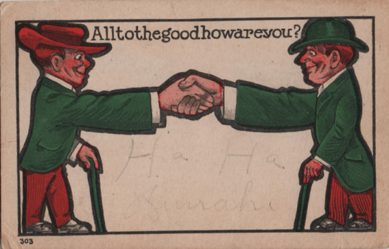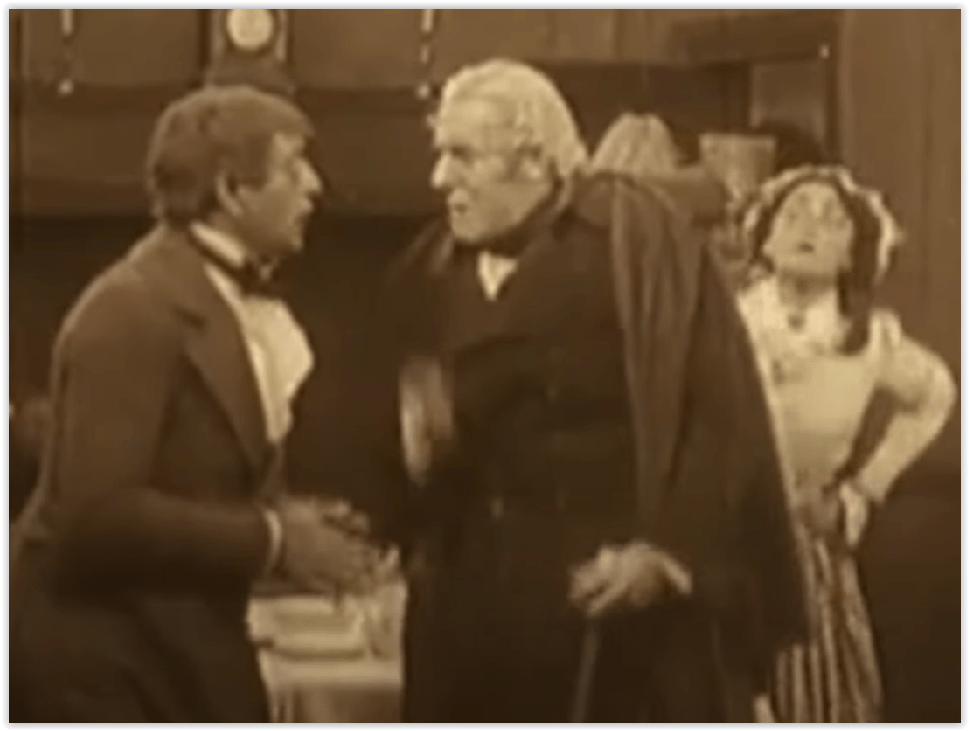 Owen is in a hurry, very jolly. To the maid answering the door, he says, “Hello, my love! Will you tell Mr. Fred I want to see him?” He pinches her chin, too, which she not only accepts, but rather likes, giving him a calculating once-over. “Fred!” “Well, who’s this?” “Your uncle! Your Uncle Scrooge!” “I didn’t know you.” “The smile changes me, doesn’t it?” Fred ushers hi inside, where the guests refuse to believe this CAN be Uncle Scrooge. It’s the smile, they complain, and besides, he said…. “That Christmas was a humbug?” Scrooge demands, “That people who celebrate it are fools? It was stupid of him! He won’t say it again, mark you: he won’t say it again, ever!” He whispers a secret to Bess, the prospective Mrs. Fred; she then whispers the secret to Fred, in great excitement. He also is thrilled, and we shift now to the Cheat Ending seen in the last installment.