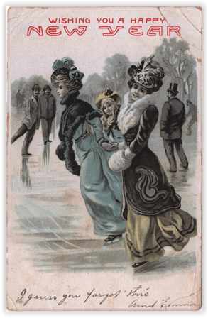 But those are artists’ renderings of winter. What about REAL winter? For that we must go to the rppc (real photo postcard, where ordinary citizens could get their own snapshots printed on postcards.) These do exist, and a goodly number of them deal with winter wardrobes. This card is part of a small collection which was created in St. Paul, Minnesota, where these couples stepped into the studio to show off their winter preparedness. No one here looks as if they wish they were on the beach.