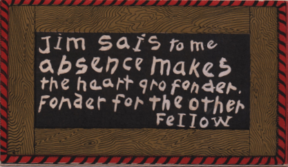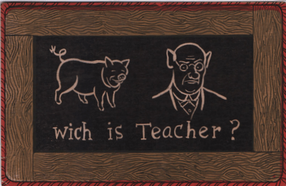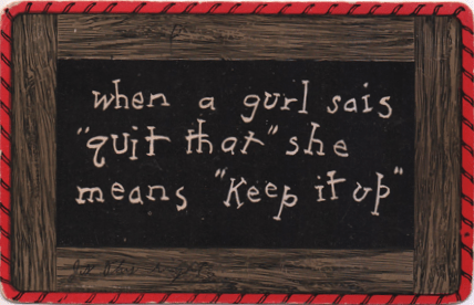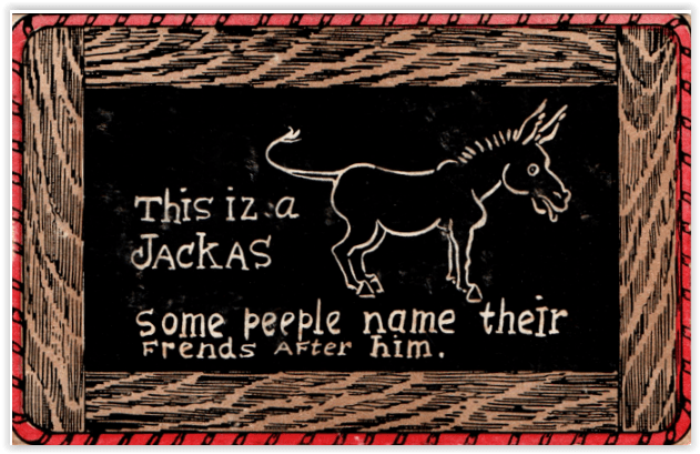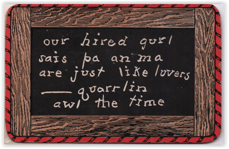Which makes the postcards based on the technology a little obscure to people in these latter days. But between 1907 and 1911, or thereabouts, dozens of different wisecracks and witticisms appeared in this standard form: something written, generally with at least one misspelling, in a childlike hand, as if with chalk on a school slate with a (printed) “wooden” border within a small (printed) “fabric” outer lining.