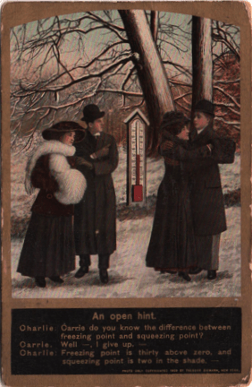 Some people actually prefer temperatures below seventy, and there are even those who enjoy the conditions of winter. True, as my warm weather friends keep informing me, there are not a LOT of stories written about the joys of being stuck in the snow on your way to work or skidding on black ice on your way home. But winter does have its rewards. There is, for example, the occasional elegance seen in the postcard at the top of this column, and the joys of cuddling for warmth, as seen here. (If you cannot read the Fine Old Joke in the caption, the gentleman is asking his girlfriend the difference between the Freezing Point and the Squeezing Point. The answer, according to him, is that the Freezing Point is thirty above zero, while the Squeezing Point is two in the shade. (I said it was a Fine Old Joke, not a good one.)