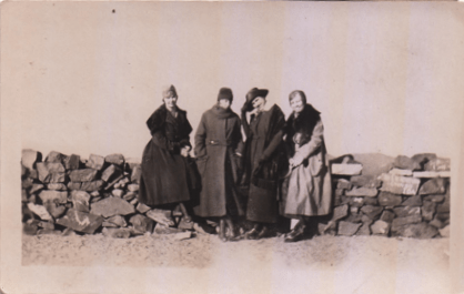 Alas that there is no label here. These ladies are obviously on some sort of jaunt themselves in chilly regions, and have paused at a stone fence which had some significance at the time. Now, about a century later, we have no idea if this is the lookout point on Pumpkin Peak or the parking lot outside the rest stop on Flaptrap Road. OR they may have simply said “Let’s stop at the first good place and get a picture of our new winter coats.”