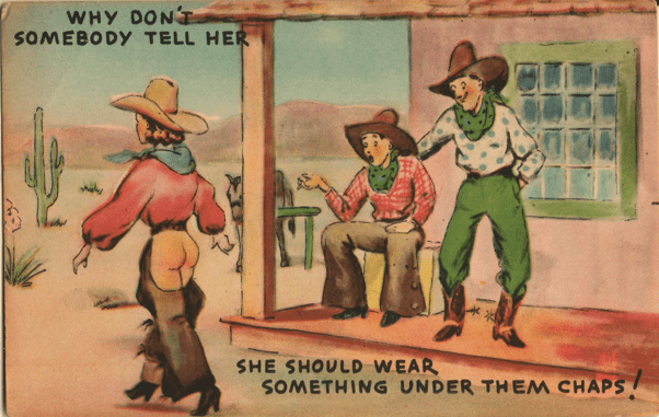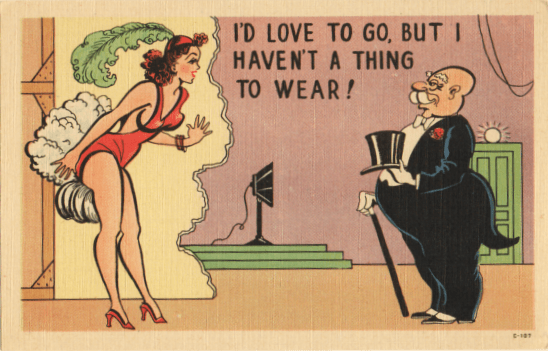 It can, um, apply to something as simple as suiting up for work. (This joke is repeated on scads of postcards. And some of us can feel superior twice, as occasionally it is obvious the artist doesn’t know what chaps look like, unlike this chap, who gets it right.)