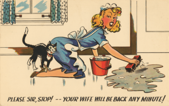 Women who indulged in cleaning floors in larger operations were generally large and ungainly…and watching through the keyhole. The ideal customers for this card weren’t looking at the cleaning women but wishing they could see what the women were seeing.