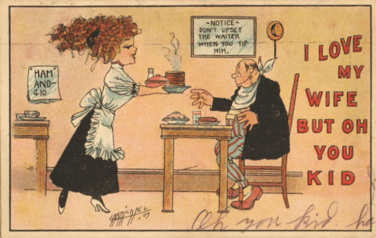 While the pretty waitress was as standard in postcards as in popular song. (The waitress snarking back at travelling salesmen at lunch can be seen in “My Mother Was a Lady”, a hit from 1896.)