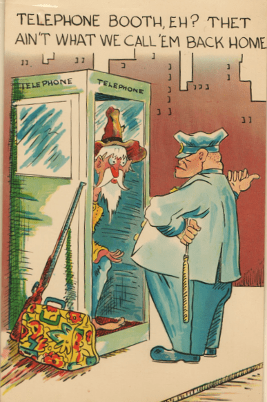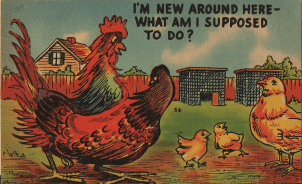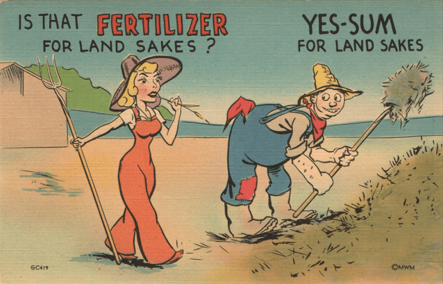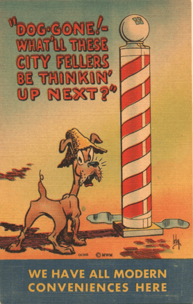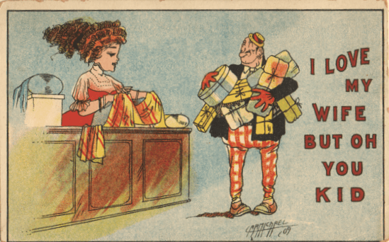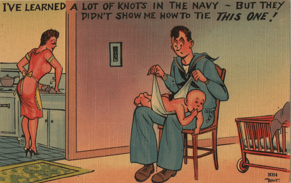 Another facet of this, often seen on bygone postcards, is the comedy of the newbie. These gags make fun at someone who is new to the job or situation, and sometimes even too young to quite understand what’s going on. Some of the same basic situations apply to both types of humor, of course/