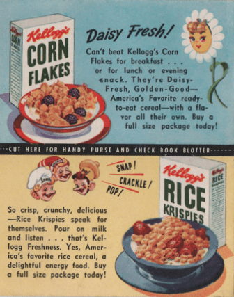 But corporate America did not become what it is today without hedging its bets. Cold cereal (also marketed as ready-to-eat cereal because, unlike oatmeal or Cream of Wheat, it required no cooking) was marketed for other purposes as well. I stare at the advertisements showing people serving a side dish at dinner composed of a large Shredded Wheat biscuit covered with gravy. The custom of topping casseroles with crushed Corn Flakes must date from around the same time.