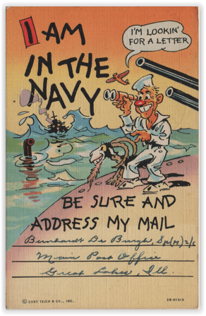 It has been suggested to me that my notes on postcards dealing with the military, particularly during World War II, have not been fully representative. The Army, including the Women’s Army Corps (ch), is well-represented, but what about the Navy?