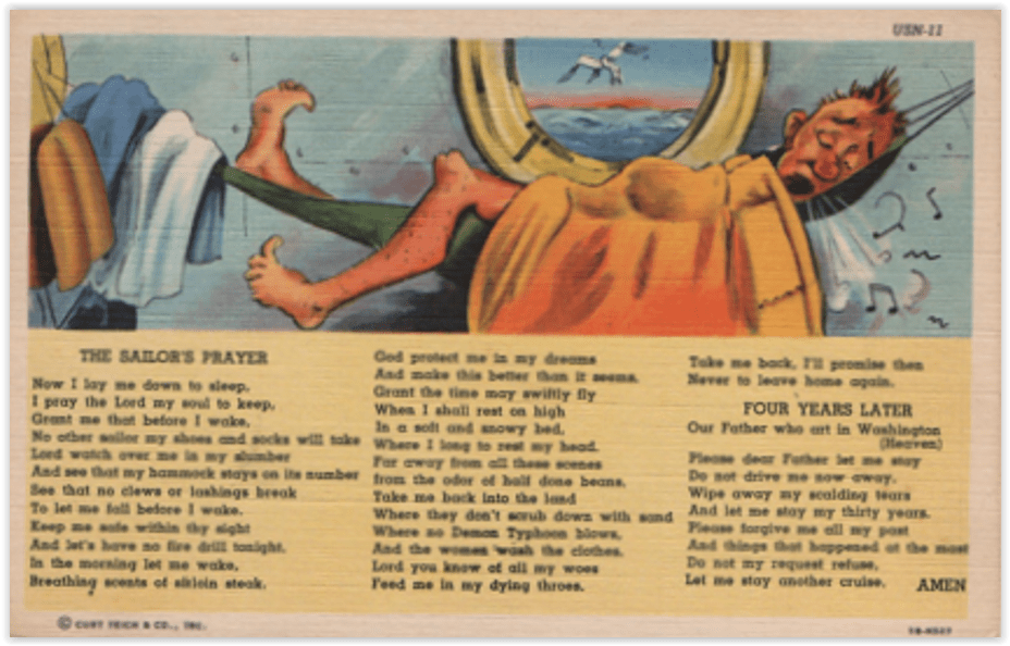 The postcards covered all of this and, as you may have noted from most of the above, also reinforced the belief that the boys taken from their homes and put in uniforms to fight were having a generally good time. Even if life afloat seemed unnatural to most landlubbers, Navy men often, according to this frequently reused verse, came to realize it was the life for them.