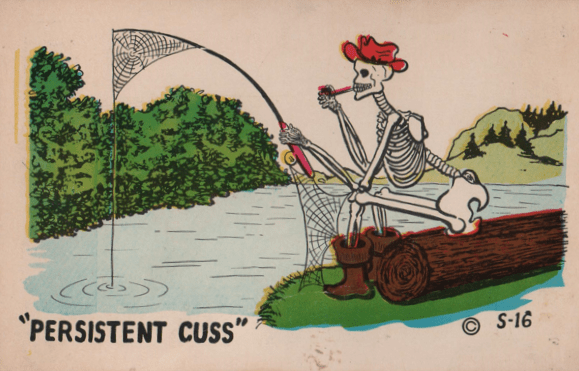 I went riffling through my postcards in search of inspiration for today’s column. The first thing that occurred to me was that riffling counts as wear and tear, and probably lowers the value of the postcards involved. Like a lot of people, I understand the risks of my bad habits; it’s just that I really enjoy riffling. Unlike a lot of people, however, I decline to become the inventor of a 39-step Stop Riffling Program, or a website which explores the psychological causes of riffling in an effort to make you understand why you riffle, and suggesting therapeutic methods of breaking your riffle addiction. Riffling may be one of the few vices which does not already have an as-seen-on-tv product to make you quit, like a menthol-infused postcard mitten which slides on easily and is available for only…where were we?