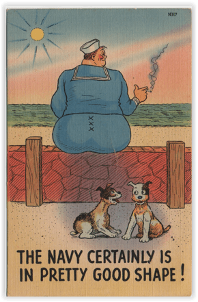 In fact, the Navy was considered just as rich a service for postcard humor, and humor generally, during the war. Movies tended to be made in California, which had a goodly number of naval bases, and while a lot of radio comedy came out of New York and Chicago, neither of those places was short on ships and sailors. (You may be thinking that New York is a logical spot, but Chicago? Well, it was the home of a major naval training base, possibly, as Donald Kaul pointed out about Iowa, it is, after all, about as far from one ocean as the other.)