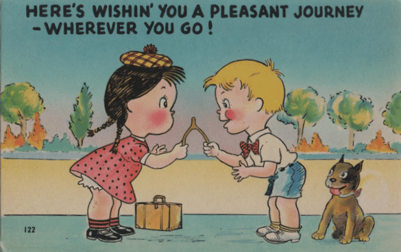 I know you had your hopes, but there are a LOT of postcards sitting around in the files. If people would get busy and BUY them, we could be chatting again about Turkey Liver Pizza. But though we nearly covered our “behinds” in the last column, there are other running gags in the world of postcard posteriors (And there were actually a couple of cards using the word “behind” which did not appear last time around. But we must put this behind…what? Oh, very well.)