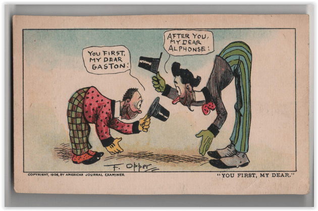 There are, according to some slang dictionaries, more words for referring to the seating arrangement of the human anatomy than any other part of the body. Among your postcard cartoonists, none was more versatile than “behind”. They could use this in a perfectly innocent sentence and then draw the illustration to leave you in no doubt about which meaning they wanted you to see. The card at the top of this column shows how this was done. The man is merely saying that his girl is behind him in the picture, and nothing else.