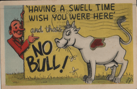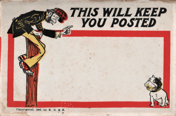 And, of course, the postcard featuring those really responsible homeowners who raised a sign to warn passersby of the presence of a vicious guard animal.