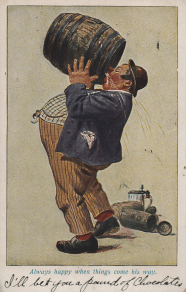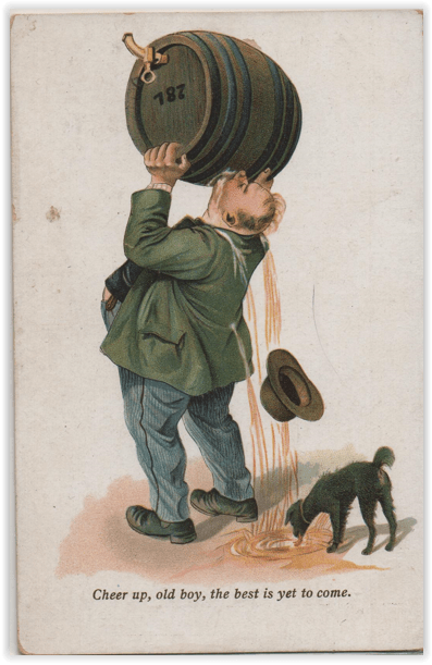 Anthropologists, as I have mentioned hereintofore, have split the western world into a Southern tradition of drinking—a modest amount of alcohol to facilitate uninhibited conversation—and a Northern tradition—massive amounts of strong drink to blot out a hostile environment. For those interested in the first tradition, bottles of wine and distilled spirits were readily available over the centuries. For those in the second tradition, the keg or barrel was the natural source of beverage. Sipping was the rule of the day for the Southern tradition; Northern style drinking called for straight guzzling. And those who consumed alcohol in the postcard cartoons often STARTED with guzzling and escalated from there.