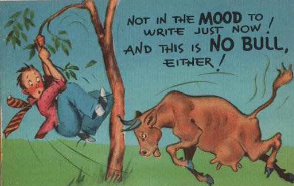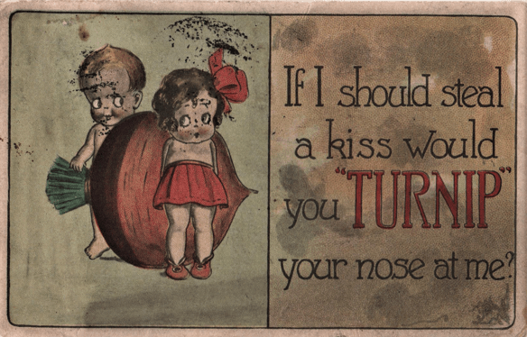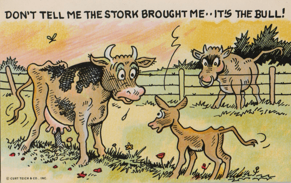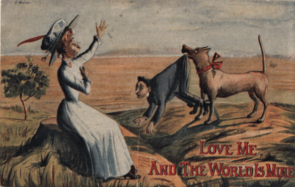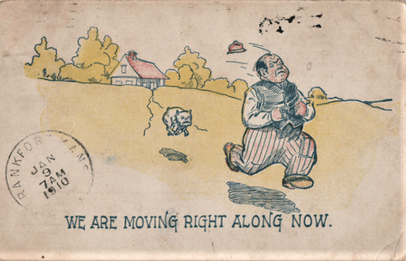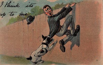We will set aside any serious postcards involving dogs. We are here concerned with the cartoonists. Our ancestors, who lived in a less sanitary and tidied-up world, were made aware of dogs just about any day, at any time of the day or night. And they were aware of all sorts of other activities a dog might pursue in the day’s schedule. Dogs on postcards sleep in the sun, sniff each other’s backsides (mostly on postcards of the midcentury and later), had sex in public (also primarily mid-century, and then mostly on cards bought at penny arcades), stole food, scratched fleas (especially on all those “Itching to Hear From You” cards). had tin cans tied to their tails (mainly early in the century this time, thank goodness, though the decline in tin can jokes is probably less due to our growing kindness and more to a lack of cans), tore up random toys and other objects, sniffed at the bases of trees and lamp posts, chased cats, chased rats, chase chickens, chased cars, chased their tails, and, especially, chased people.