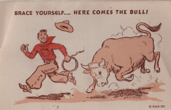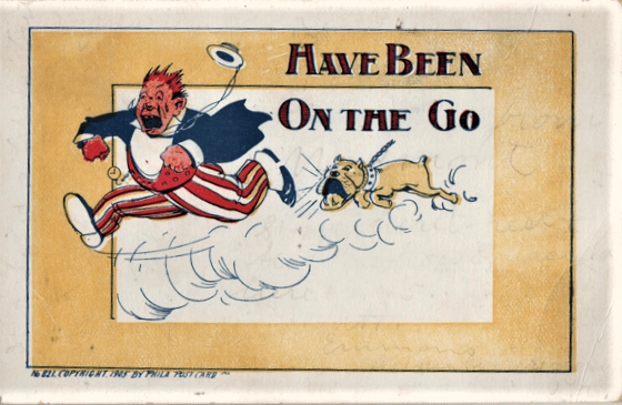 Bulls and goats will often be found chasing people on postcards, but this was increasingly a rural pursuit (literally.) Dogs, being as urban as people, could be found guarding their home territory (whatever they perceived that to be, in their complex canine craniums) I suspect the dude at the top of this column actually had the dog sicced on him by Annabelle’s father, but in general, no motive is really needed. In the following case, the rather pudgy bulldog may simply have decided that this was quarry he might actually be able to catch.
