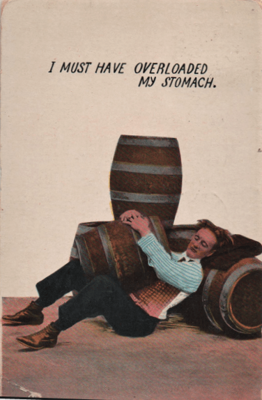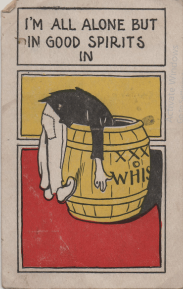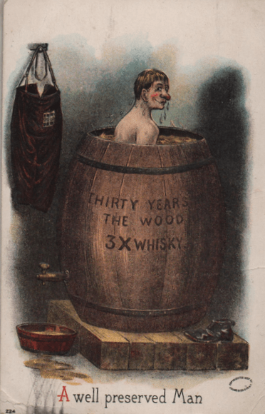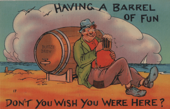 But in that age when postcards were the equivalent of today’s tweets, the whiskey barrel was a very common artifact, and presented more opportunities for fun than mere beer, which was actually perceived as more of a family beverage back in the day. (It was, I am informed, entirely plant-based and filled with nutrients which the industry has since filtered away.) The whiskey barrel was for your dedicated drinker, and was obviously a single-serving container.