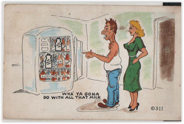 Not long ago in this space, we considered postcards suggesting that what the average drinking male wanted from his alcoholic beverage was more. Another load of postcards has come in suggesting there is an aspect of this we did not consider.