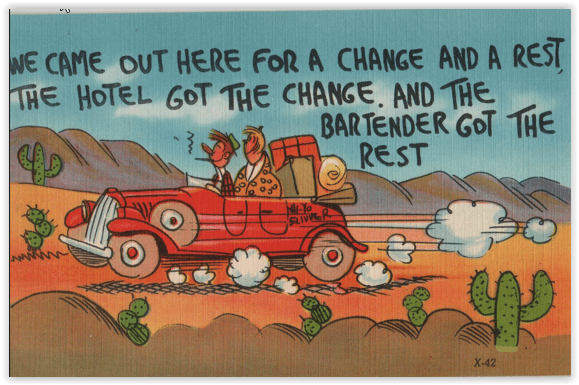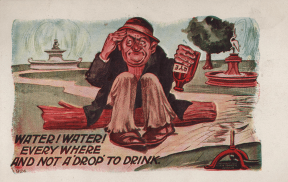 But the overwhelming source of humor, at least among the cross-section of postcard history represented by my inventory, deals with another facet of drinking entirely. These cards are concerned with getting enough to drink in the first place.