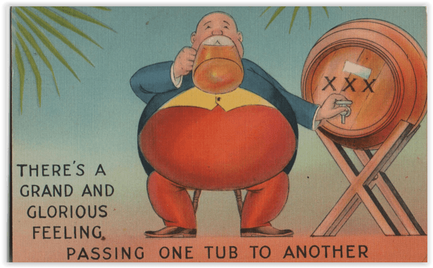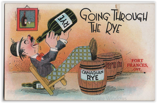 But in the United States, where Prohibition came in to trouble cartoonists in the second generation of postcards, it quickly became a matter of abandoning mere bottles for barrels. And to get these barrels, necessitated by dry laws at home, they had to travel north of the border.