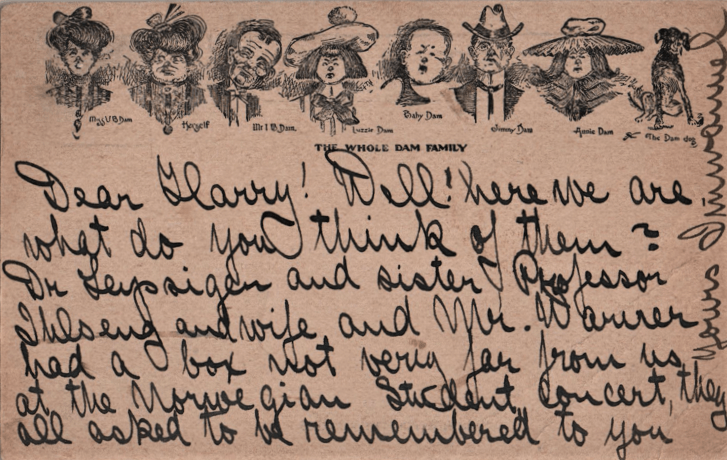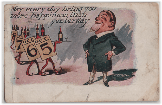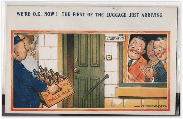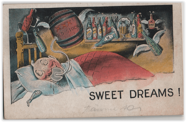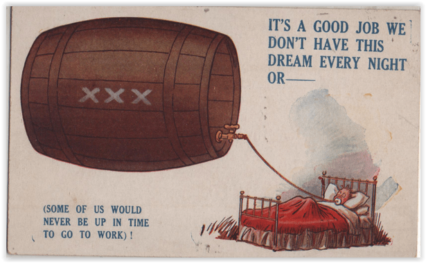This thought came to me as I was sorting through the postcards in inventory under the subject heading of “Drinking”. I was expecting to see vast numbers of cards dealing with the struggle of the over-served drinker to find a way home, the fumblings of the tipsy gent to get into the house unobserved by his vigilant wife, and the logic used by a well-oiled partygoer to deal with pay phones, clocks, and cigars. These were all present, along with the gent making himself comfortable in a gutter for the night and the tendency of alcohol to make people think they can sing.