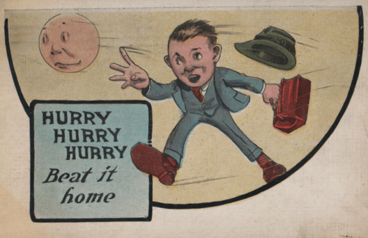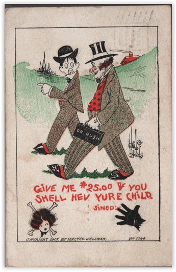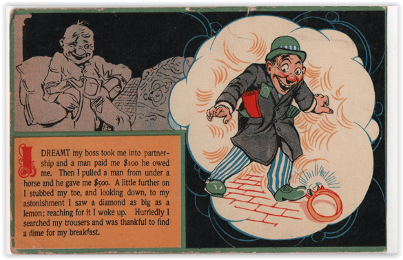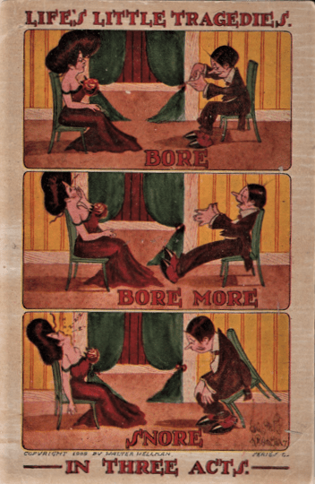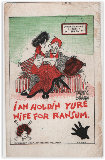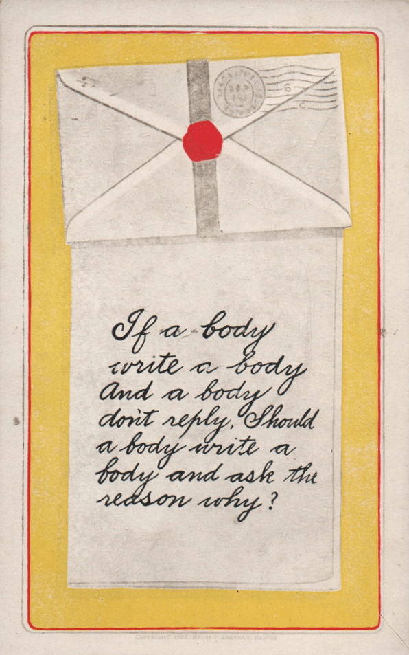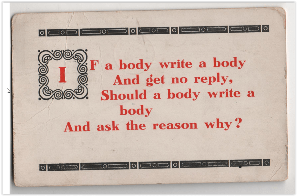 Even the dogs of Scotland were hauled in on the joke. (Note that “Hoot, Mon” was as necessary to a stage Scotsman as “Begorrah”: was to a stage Irishman. The reason you don’t see it on more postcards is that your postcard artist also had to be thrifty…with space for captions.)