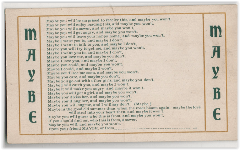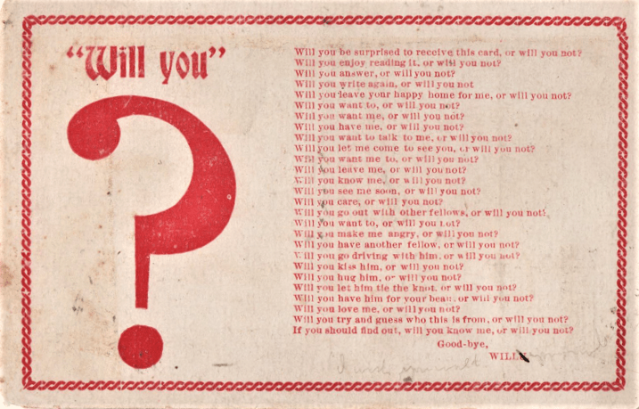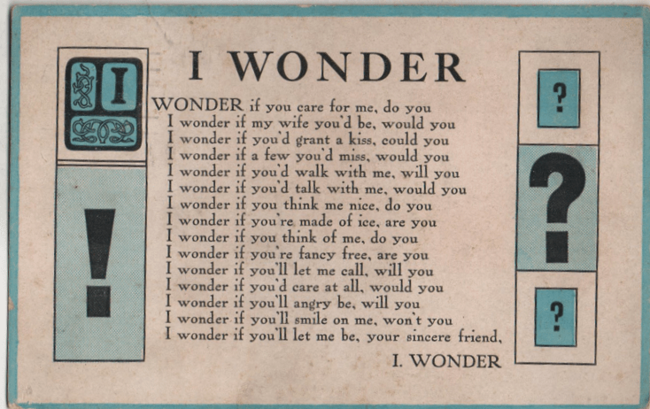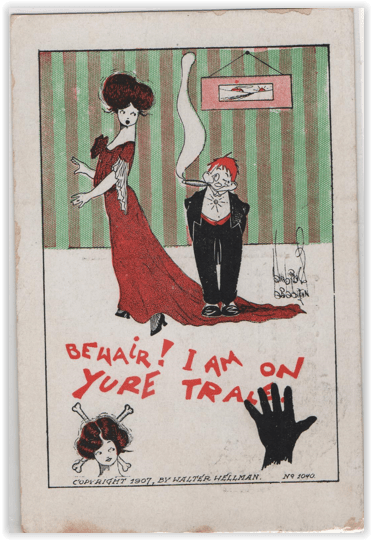 Artist Frederick J. Cavally did a magnificent set of ethnic stereotype postcards in 1910 or thereabouts. He seemed to like doing faces—a number of his non-ethnic postcards feature a large funny portrait with a message—but this really exercised his talents. Each ethnic group was portrayed in two cards, one a male portrait and one a female, with a thickly accented demand to know why you hadn’t written lately. These portraits were very detailed and VERY much a complete portrayal of that ethnic group as seen by the conventions of the vaudeville stage. (There was a phrase for this: an obvious stereotype was a “:stage Irishman” or a “stage German”.) The German man had a little pickelhaube helmet nestled in his hair, the English male wore a monocle, and so forth.