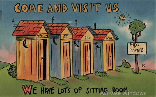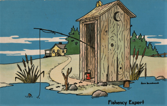 And we have a few postcards which mention the temptation to sit and read that old catalog in the outhouse, you need to go to the modern age to find a direct cartoon reference to it.