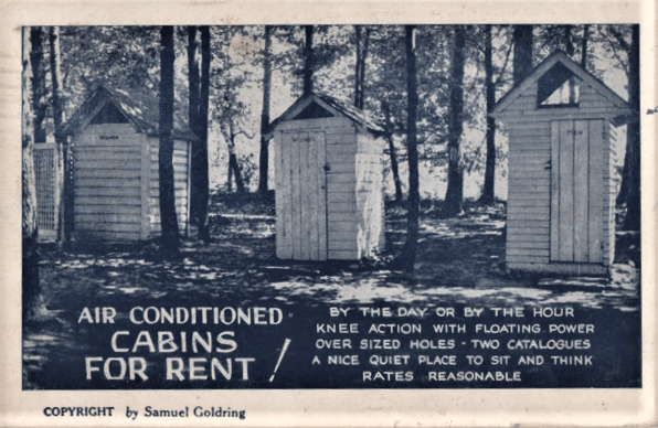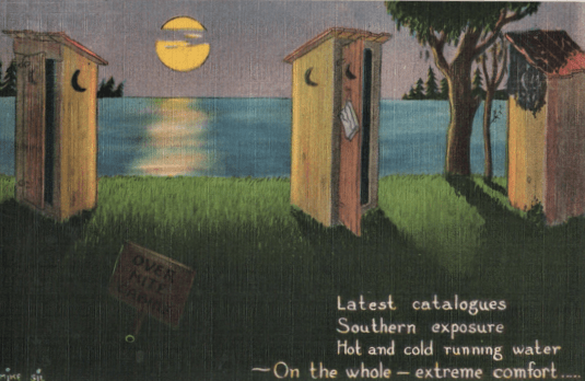 And this sitcom situation could simply not have happened in the days of the house out back. (For that matter, it could not have been shown on a sitcom in the days when this postcard was new. Anybody here old enough to remember the early 70s, when the sound of a toilet flushing on a sitcom was a national scandal?)