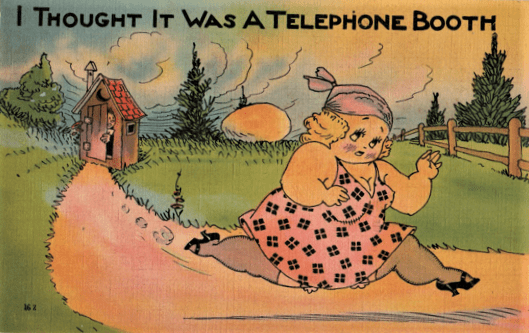 “Modern age” is relative, of course. This card is about twenty years older than the gas station one, and is now a century old, and we find the habit already being blamed on boys. (This, by the way, is the only bathtub postcard in today’s effusion of wit. The bathtub has its own literature and line of cards. The whole association of bathtubs and toilets is probably a modern invention, brought on by the need to run plumbing to both. In the days before indoor plumbing, a lot of people bathed in the kitchen, since that was the place to heat the water. Single men who did not have access to a handy kitchen for this person could often buy a bath at the barbershop, which had a back room for that, and a tub of water which was changed, oh, once a day. This made sense in some towns…I guess what this all boils down to is that one of these days, this blog is going back into the bathroom. You have something to look forward to.)