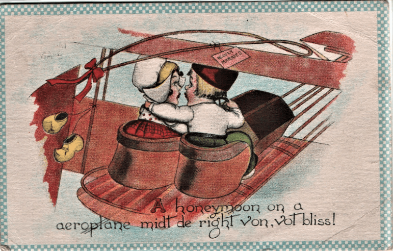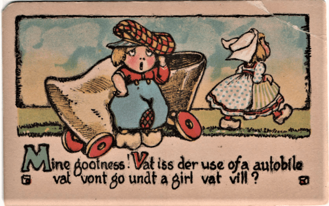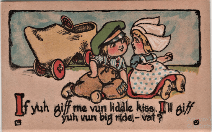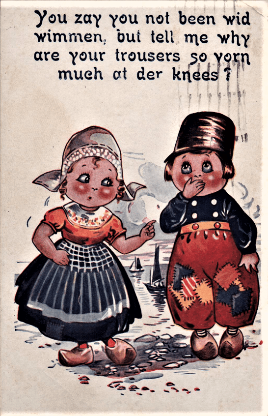 This one, however, has no intention of moving along transgressive lines. It’s our favorite Dutch kids back again, and referring to the fact that a lover would go down on one knee to declare his undying love. The young lady is suggesting that his knees are patched because he’s been reciting poetry on one knee, and not that…of course, then why would BOTH knees…well, lovers could kneel using both knees, and….