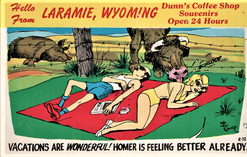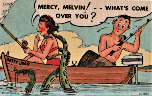 I wasted a great deal of time researching this card. I am still convinced that a hump was some kind of term expressing the form of a wave, and we are encouraged to make the connection between that surfside term and the quite alarming hip measurement of this bathing beauty. “Humping” existed as a slang term as early as the Revolutionary Wat, but people who performed this were Humpers, never Humps. I hope we have made that clear. (Um, you DID think that, didn’t you? It’s not just MY dirty mind that…next slide, please.”