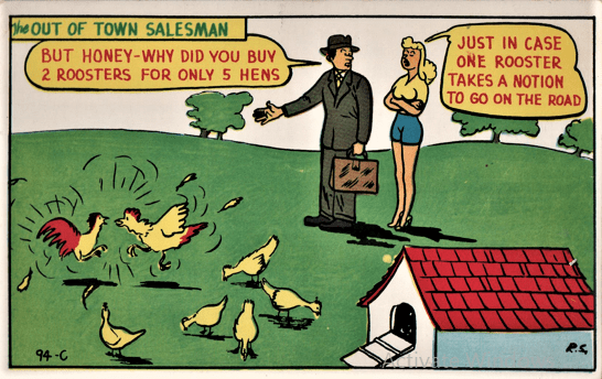 We have not yet covered the vast number of postcards about the activities of people on their honeymoon (hinted at above), the vast number of cards which involve obviously illegitimate offspring due to maternal flings (so far I’ve seen rabbits with skunk stripes, colts with mile ears, and a WHOLE lot of baby chicks with duck bills.) The postcard studies of what roosters do for a living cover at least seventy years, and I do not refer to crowing at sunrise.