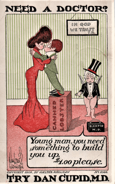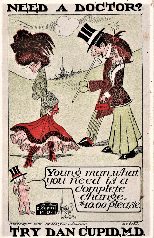 Among his most popular series was one h produced just at the start of the Golden Age, in 1908, as the United States announced one whole side of a postcard could be for the picture alone. It proved so popular that it served as the basis of a silent movie in 1918. These were the adventures of Dan Cupid, M.D., who went through the world dispensing, well, a certain kind of medical advice.