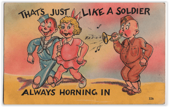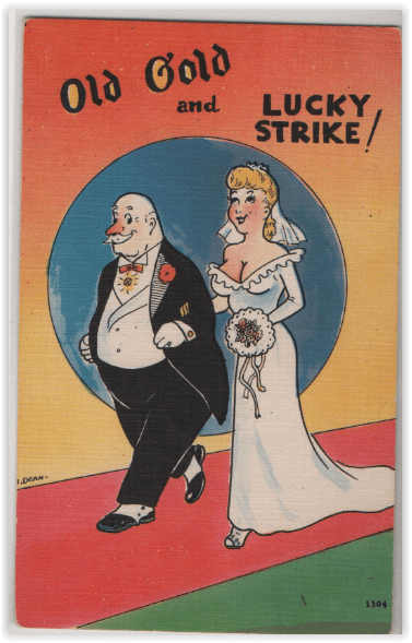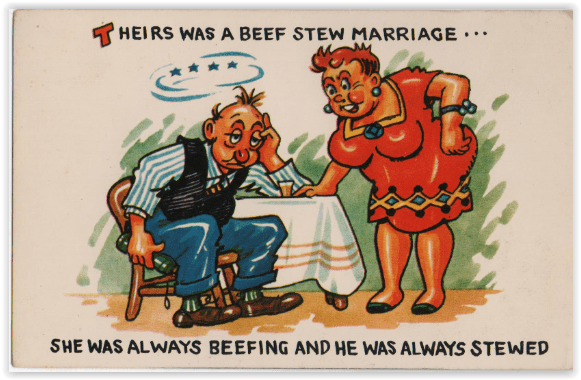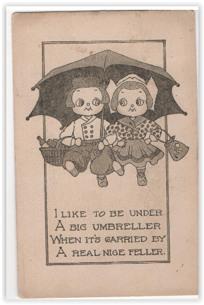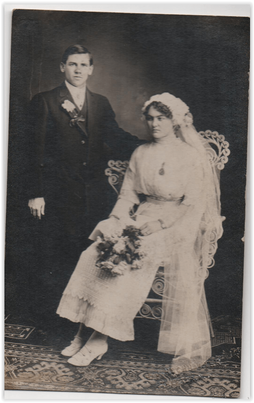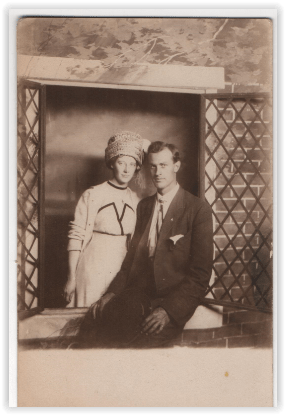 Or fancy outfits (an RPPC could be taken in a photo studio: this window is frankly fake, but it does its job as a frame, and probably did so for dozens of couples even without funny hats.)