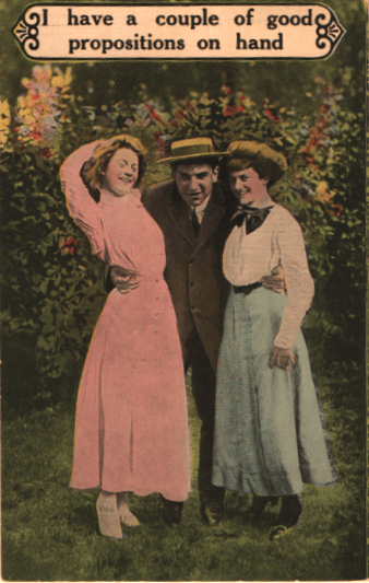 The table for sitting could be a prop on the dark side of romance, of course. I hate to finish with this sourpuss, but I must get back to writing my next best-selling novel. If we’re going to study the use of beds in naughty postcards, extra funding will be essential. Until then we’ll table the matter. (Don’t make that face: you knew it was going to be here.)