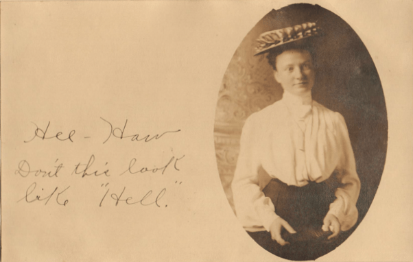 Those who look at postcards to learn about the styles of our ancestors will notice a vast variety in the tables available for hugging and/or kissing. I’m not perfectly sure whether this is a table or a plant stand: it seems too narrow to me to be considered a high stool