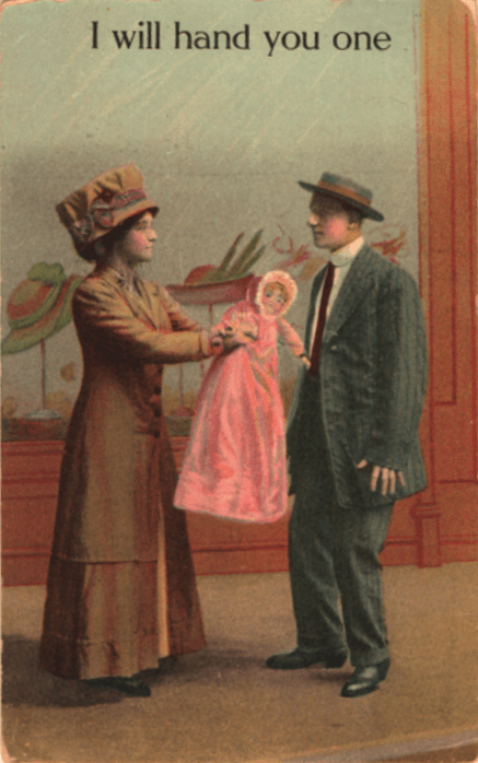 Wherever fashion goes, cartoonists are sure to follow, so postcards began to boldly push chests where no chests had gone before. The not very subtle S Curve became even less subtle in their hands.