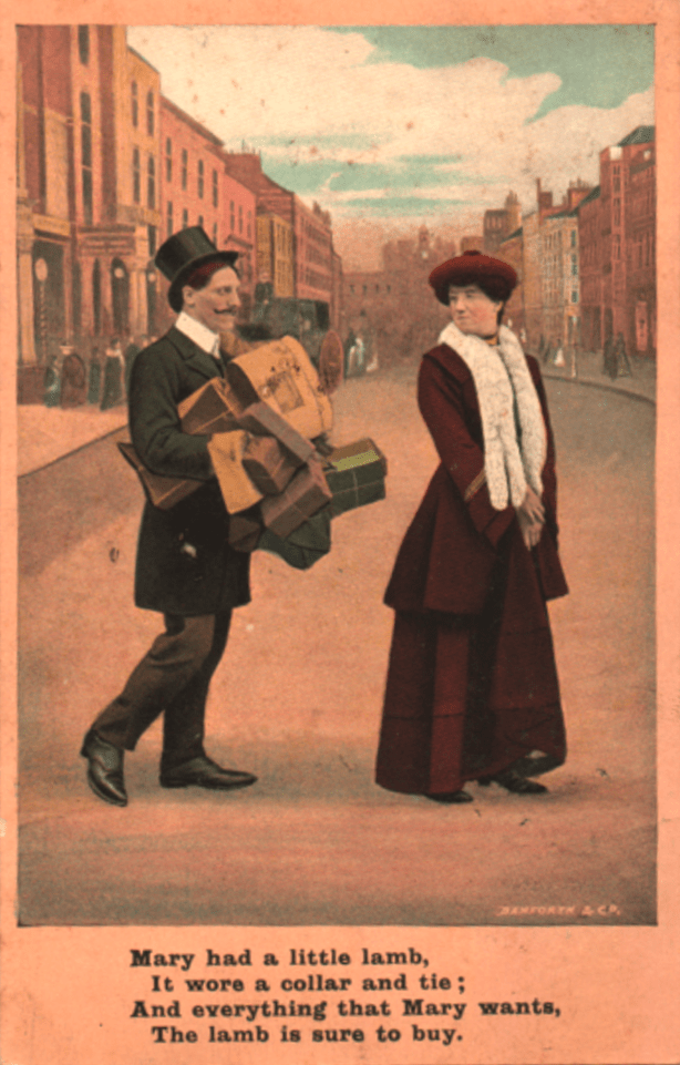 However, the piece of furniture coming closest to the chair or the settee for romantic couples in postcards is probably the table. (What? Beds? This was a hundred years ago, klddo socko: couples were found on or in beds only in cards featuring married couples having a fight, or naughty postcards, which we will discuss at some future date. By the way, the really naughty cards didn’t use beds either: blankets would obstruct the view.)