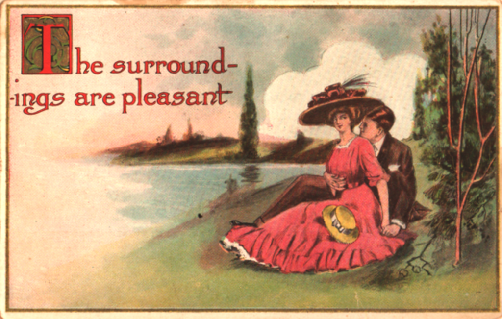 We have discussed, hereintofore, a number of important props used by courting couples on postcards of a hundred years ago or thereabouts. We have discussed park benches, rowboats, and hammocks. But romance is nothing if not inventive (say several websites that have turned up on my computer for absolutely NO REASON) and there were plenty of other possibilities.
